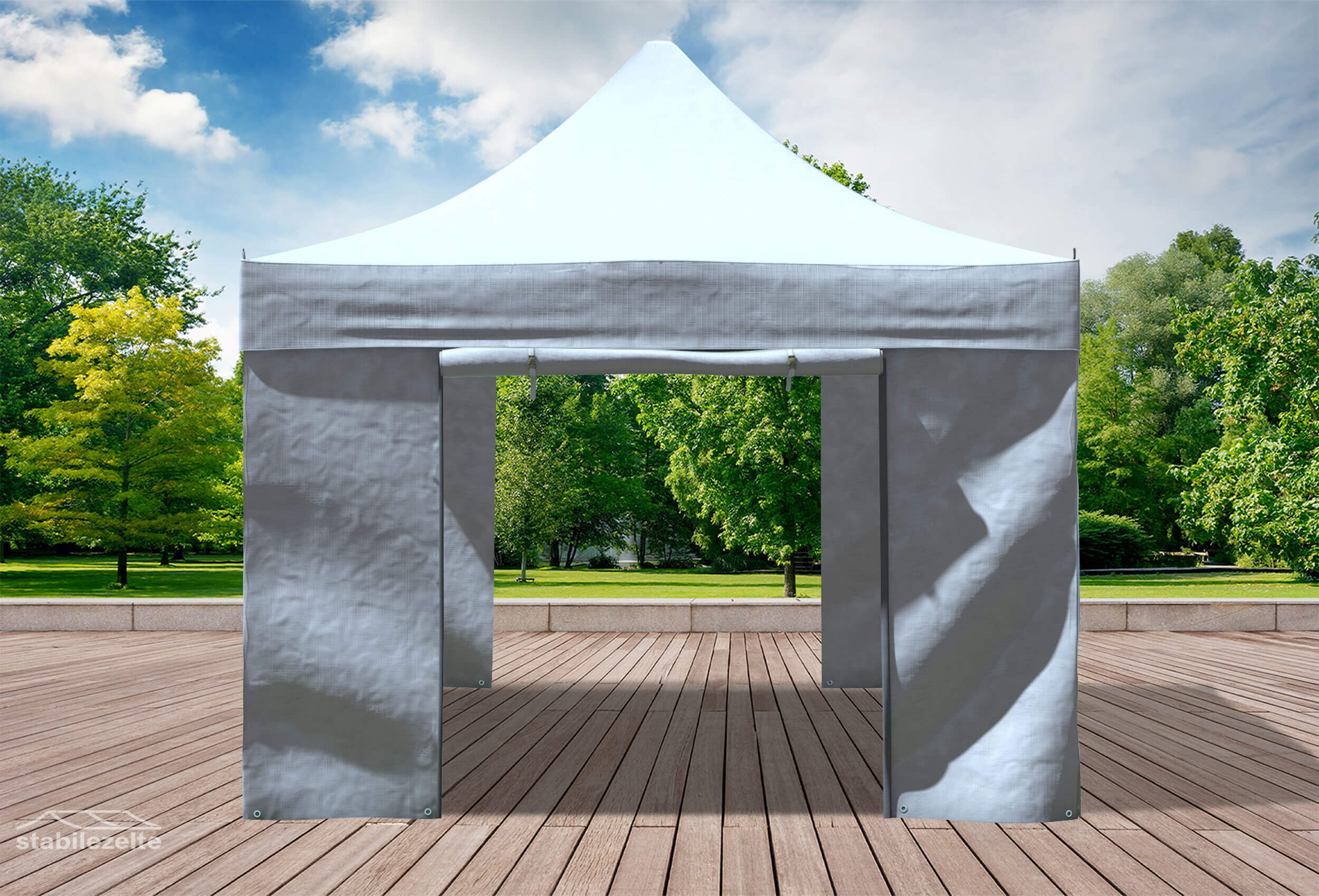 vergleichbar mit LKW-Plane - glänzend glatte Oberfläche Umlaufende Industrie-Klettverbindung zur leichten Fixierung der Seitenteile direkt an der Dachplane Seitenteile mit Profi-Reißverschlüssen winddicht koppelbar - Zusätzlicher Klett zur Fixierung an Standfußstangen Stabile Klarsicht PVC-Fenster sorgen für ein lichtdurchflutetes Zelt und können bei Bedarf von innen blickdicht verschlossen werden