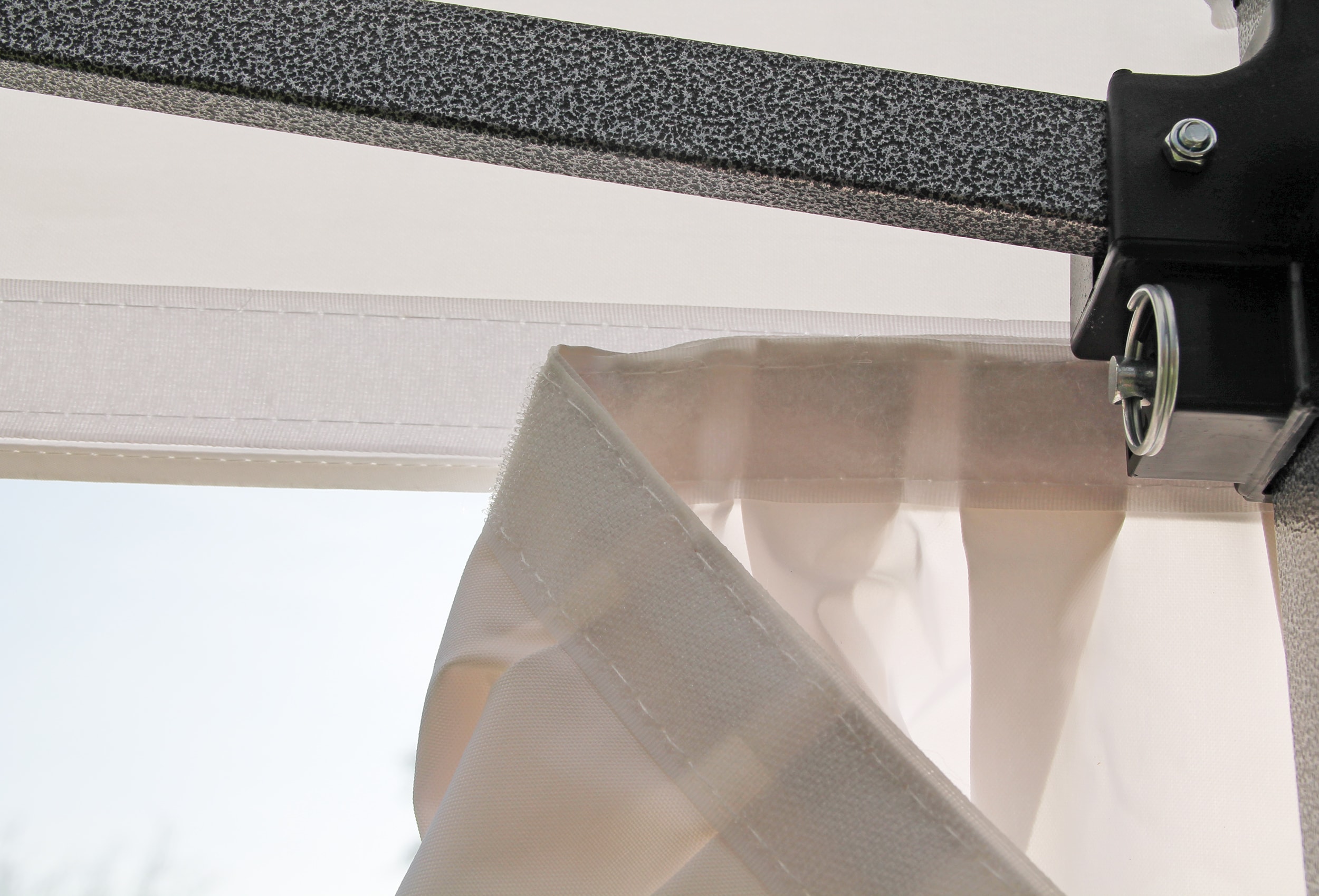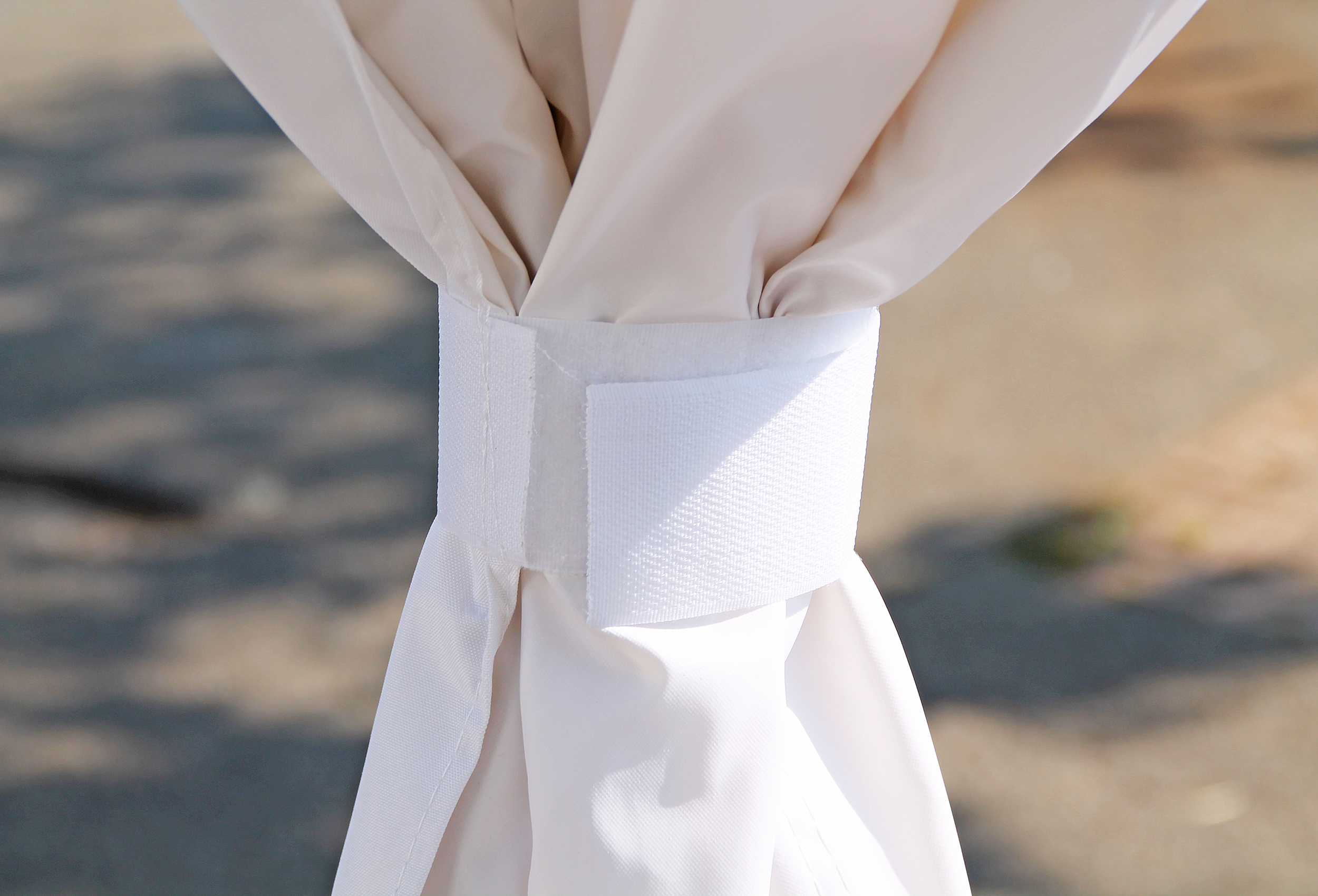 Einfache Montage - Einfach an den Klettverschluss-Elementen der Dachplane anbringen und Schal um die Standfußstange fixieren
